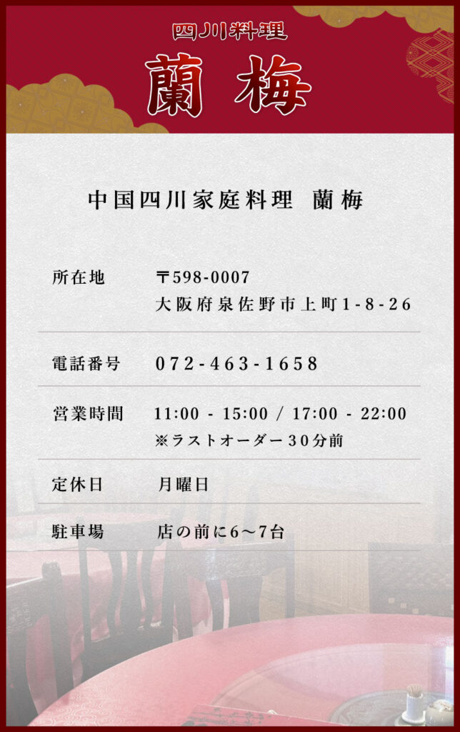 南海本線 泉佐野駅、東口より徒歩11分のところにある、大阪で一番の麻婆豆腐が食べられる中国四川家庭料理のお店「蘭梅(らんめい)」